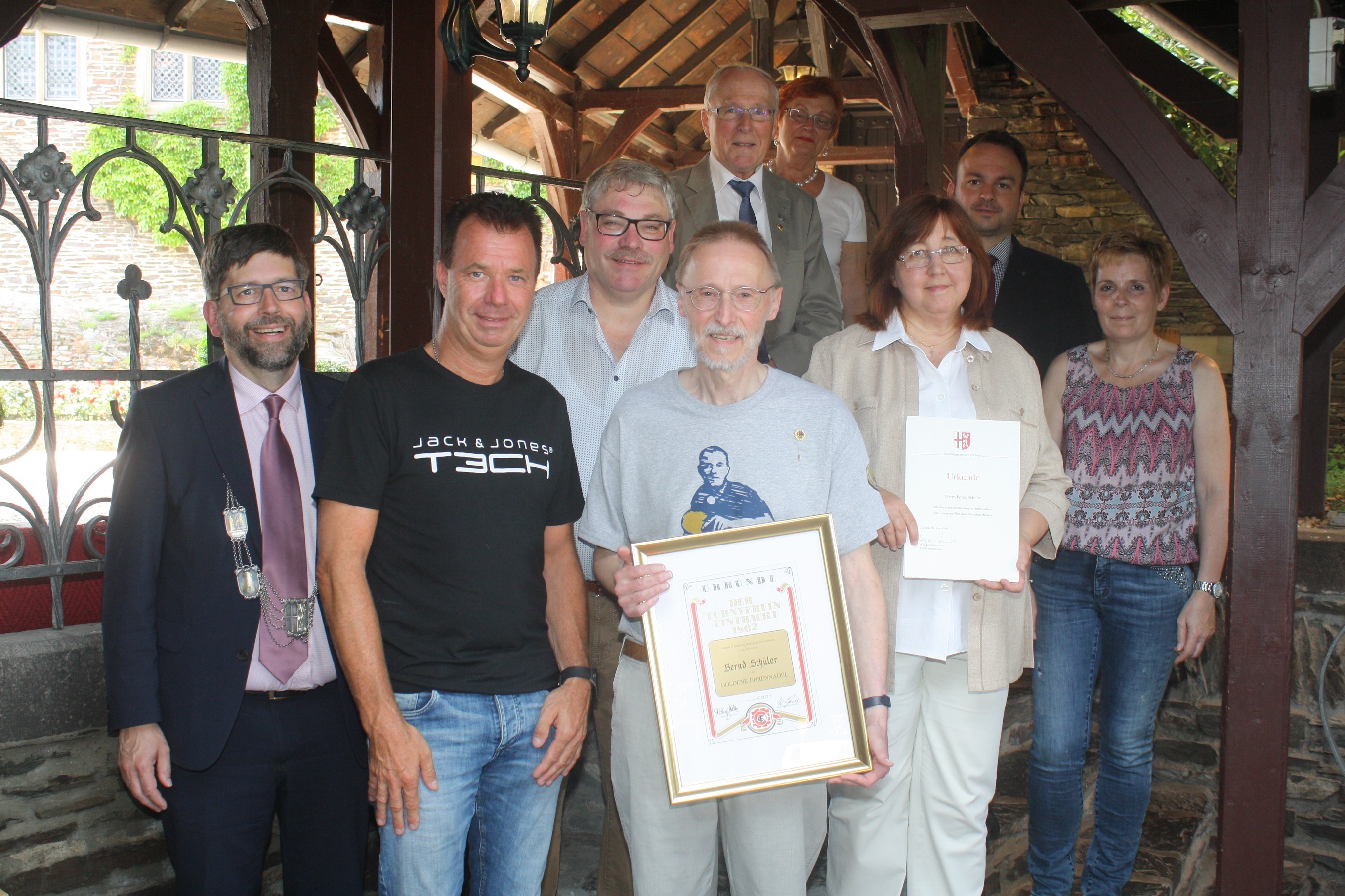 v.l.n.r. : Stadbürgermeister Wolfgang Lambertz Trainingspartner Michael Uhrmacher, TV-Vorasitzender Willy Müller, Wilfried Gerdes (hinten) Bernd Schuler (vorne), Rosi Kalinowski (Seniorenwartin TV Cochem), Frau Schuler, Ratsmitglied Marco Steuer und TV-Veranstaltungswartin Claudia Wilde.