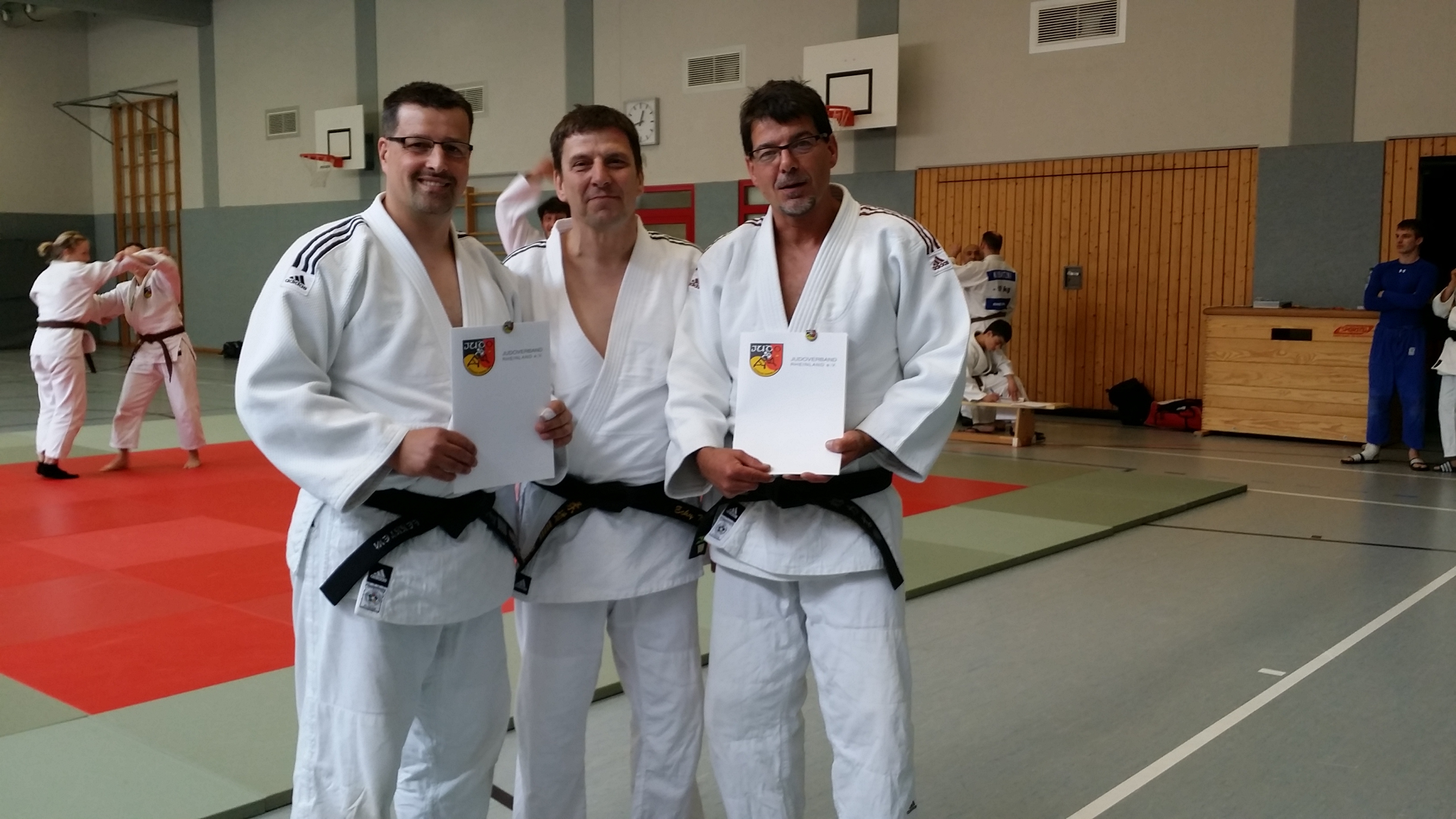Vizepräsident Eckhard Katluhn (Mitte) überreichte den beiden TV Judoka Lars Ferrlein (li) und Jürgen Sabel (re) die silberne Ehrennadel des Judoverbandes Rheinland beim Kata-Treff in Cochem, den die beiden seit 2007 monatlich organisieren.