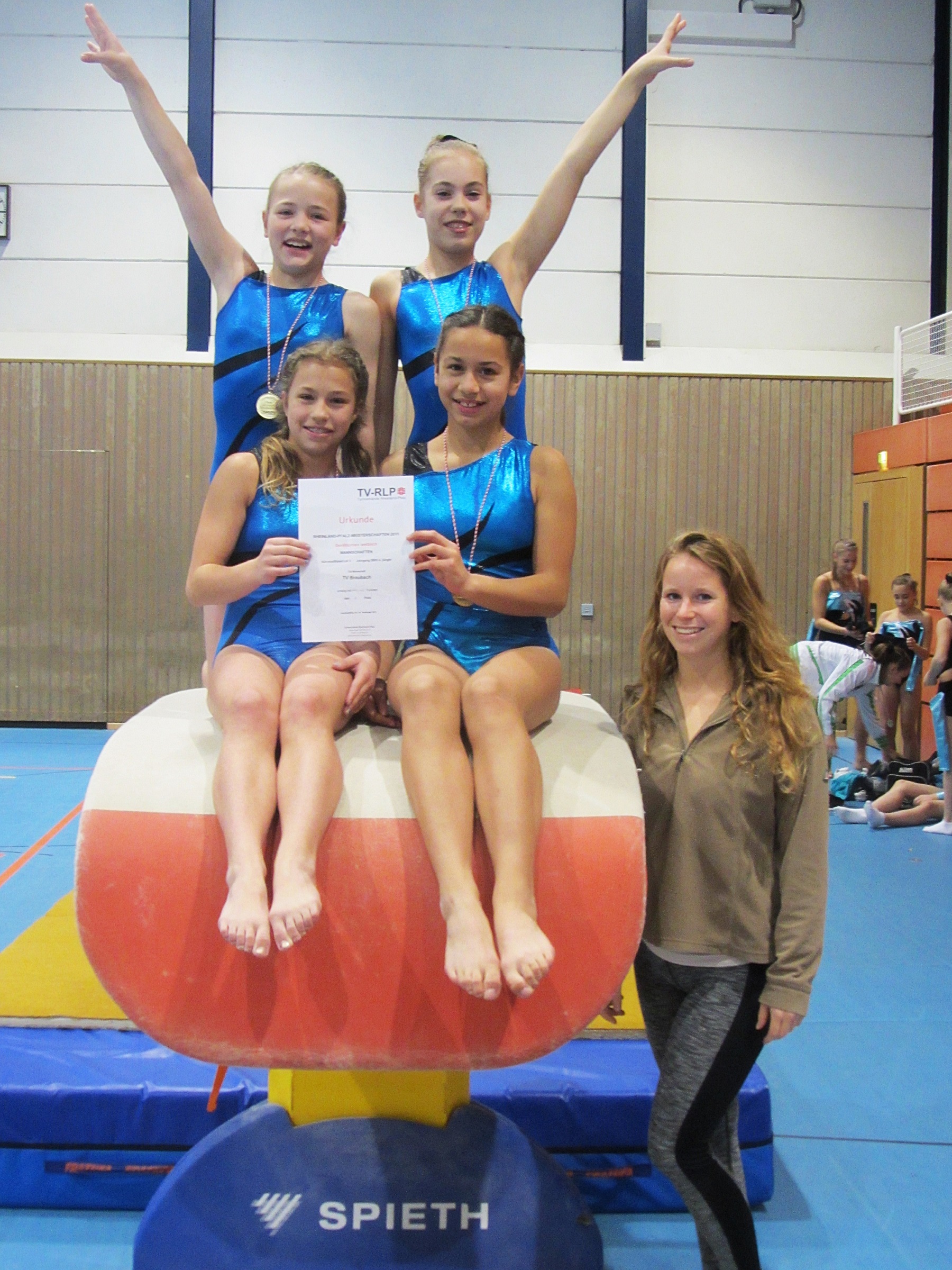 Maja Walter (hinten links) freut sich mit ihren Mannschaftskameradinnen und ihrer Trainerin über den 1. Platz bei den Rheinland-Pfalz-Meisterschaften 2015