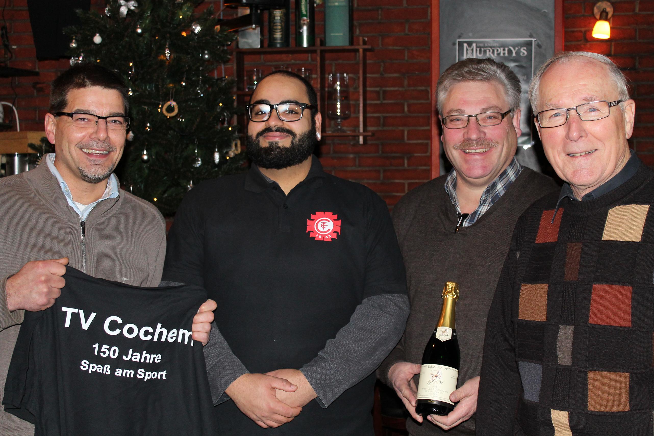 Vereinsmanager Jürgen Sabel (li) überreichte Steven Kramer (2.v.li.) zur Begrüßung ein Poloshirt und eine Kappe des Turnvereins Cochem. Auch die Vorsitzenden Wilfried Gerdes (re) und Willy Müller (2.v.re) ließen es sich nicht nehmen, dem 1200. Mitglied persönlich zur Aufnahme zu gratulieren.